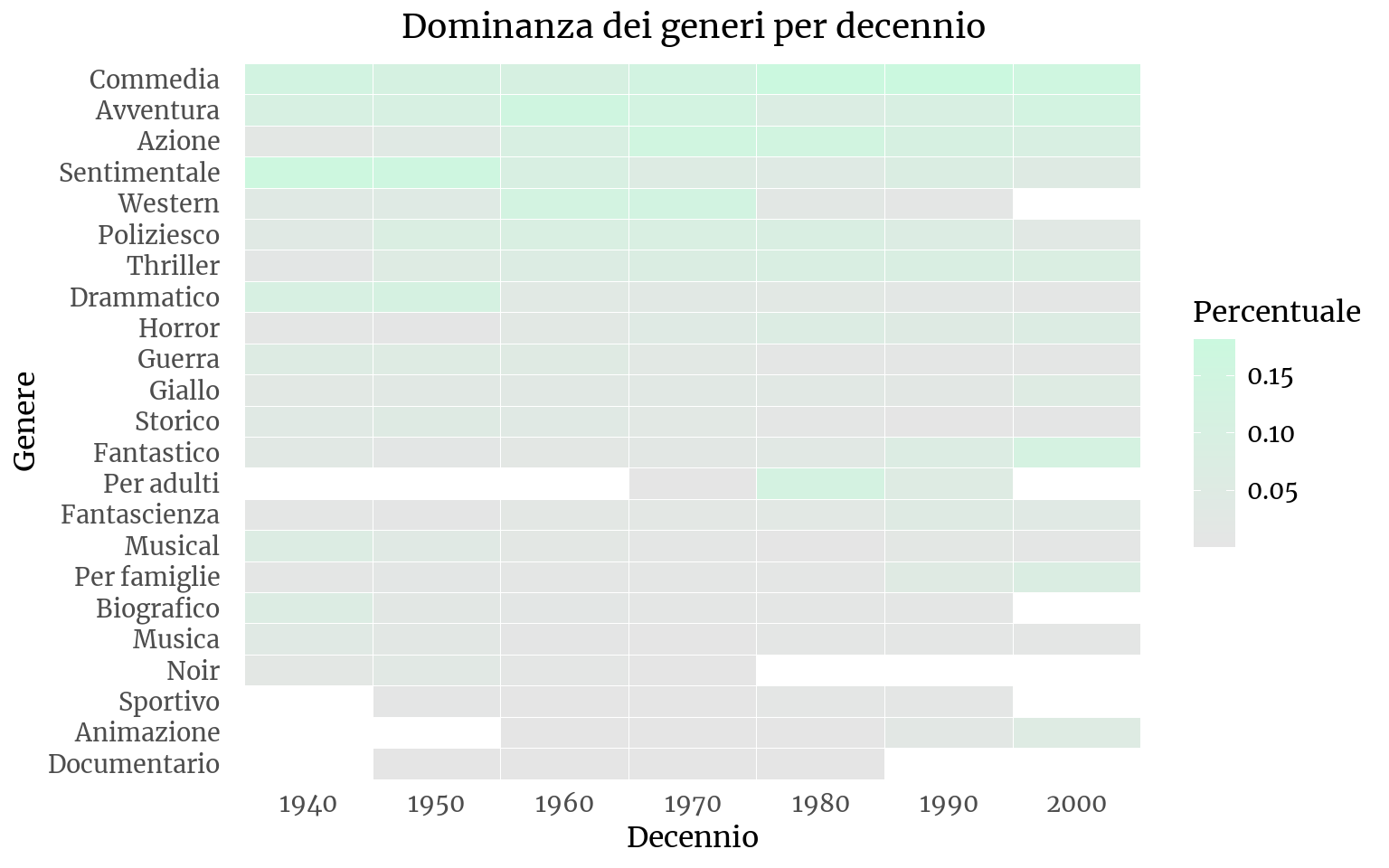 L’analisi dei generi cinematografici proiettati nel corso dell’attività del cinema Sestito offre uno sguardo privilegiato sulle trasformazioni culturali e sociali. Il primo strumento interpretativo è un grafico dei generi per decennio, costruito a partire da un dataset opportunamente “ripulito” eliminando la categoria drammatico quando associata ad altri generi. Questa operazione consente di ridurre una distorsione frequente nelle classificazioni enciclopediche, in cui “drammatico” tende a funzionare come categoria-ombrello sovrapposta a generi più specifici.