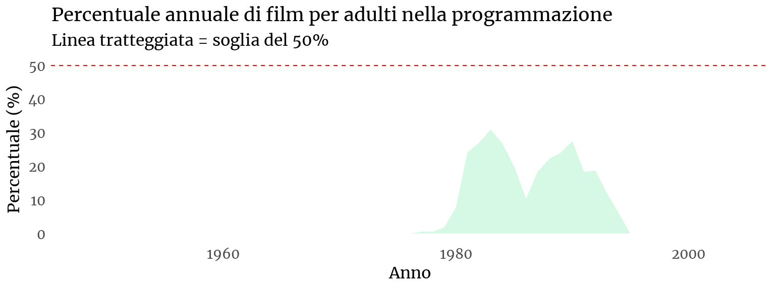 Un fenomeno di particolare rilevanza è l’incremento dei titoli classificati come “Per adulti”, che diviene evidente a partire dagli anni Settanta e raggiunge il suo apice tra gli anni Ottanta. La presenza consistente di tali film nella programmazione si inserisce in un contesto storico più ampio: la diffusione del cinema erotico e pornografico nella cosiddetta golden age italiana, quando molte piccole sale, soprattutto in aree rurali e periferiche, adottarono questo tipo di programmazione come strategia di sopravvivenza economica, di fronte alla competizione televisiva e alla trasformazione delle abitudini spettatoriali.